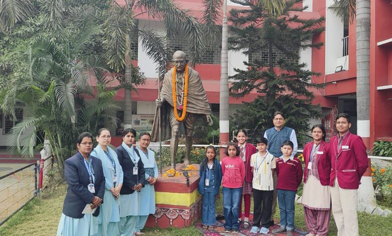 Senior teachers including Neelima Patel, Sabita Dhal, Sunanda Praharaj, Manisha Chand, Namita Pandey, Monika Srivastava, Bijay Dash, along with students, collectively offered floral wreaths at the life-size statue of BapuJi and presented his favorite devotional tune in his honour. During the program, all present resolved to adopt a simple, modest, and Swadeshi-oriented way of life in the spirit of Mahatma Gandhi. All the teachers of the school were present and contributed to making the program a meaningful success.