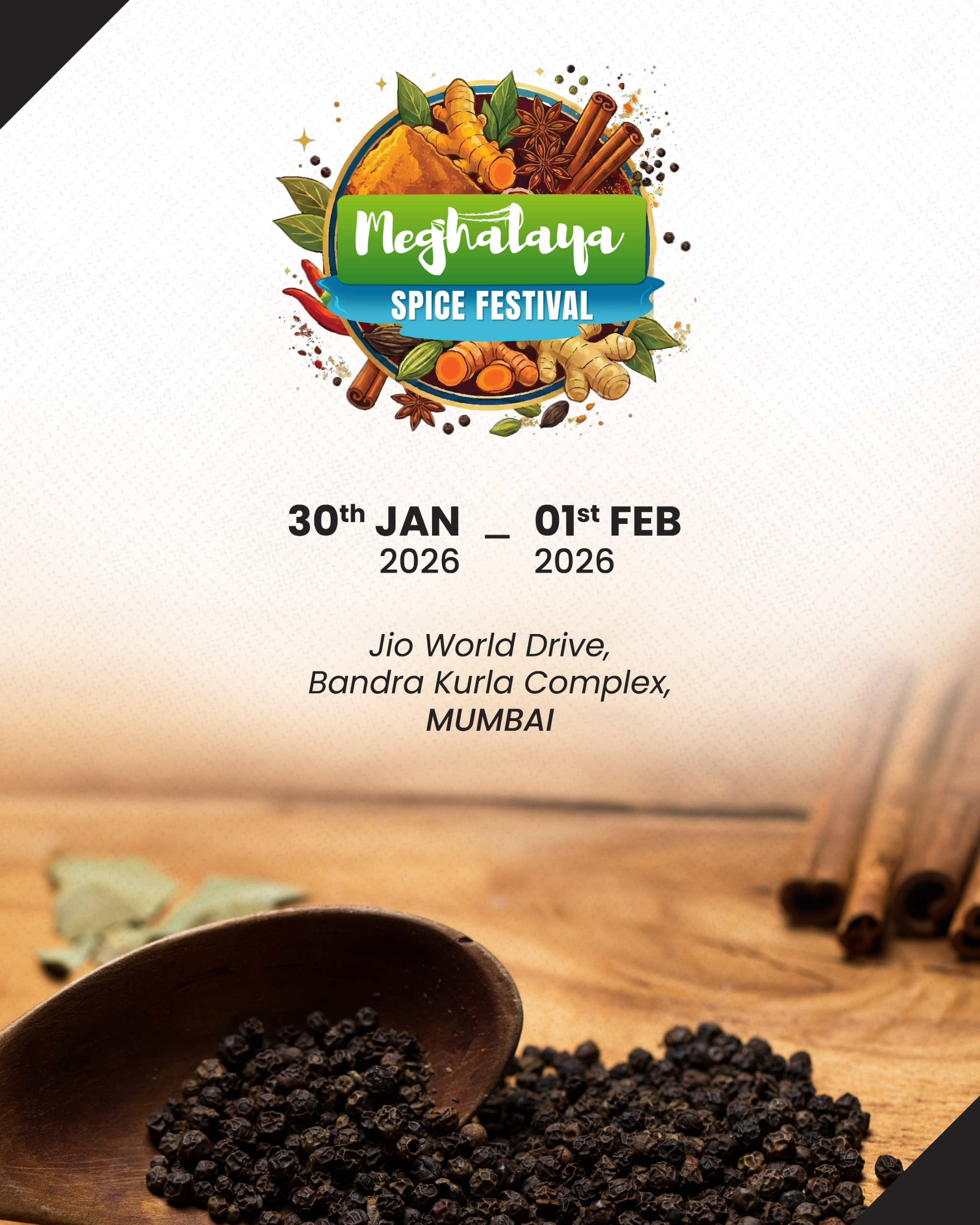 National, :The Government of Meghalaya will organise the first Meghalaya Spice Festival from January 30 to February 1, 2026, at the Jio World Drive, Bandra Kurla Complex Mumbai, to showcase the State’s premium spices and strengthen market access, value addition and export linkages for farmers and producer enterprises. The festival will connect FPOs, SHGs, cooperatives and MSMEs from Meghalaya with buyers, exporters, retail chains, HoReCa players, nutraceutical brands and institutional buyers, positioning Meghalaya as a key source of high-quality, traceable and sustainably produced spices.